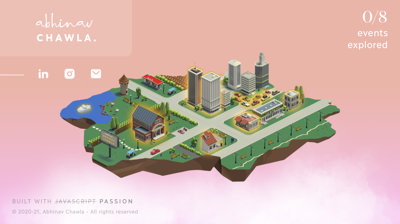 The portfolio is represented by a floating island with the landscape of a town marked down by some of the significant events of my life. I tried to gamify the website (a bit) and I hope the π shows you around my town! Feel free to click around on different items on the map to learn more about the corresponding events.