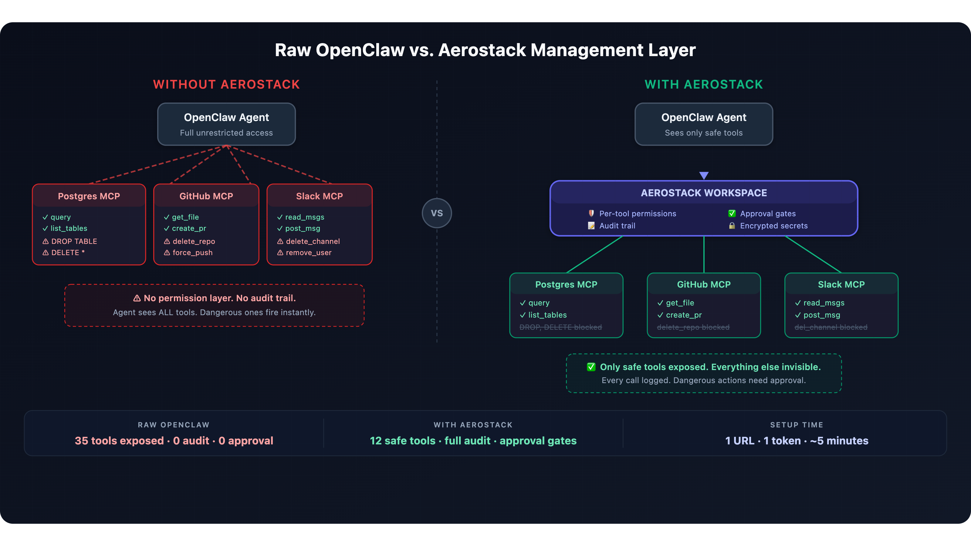 ![Raw OpenClaw vs. Aerostack Management Layer — Side-by-side comparison showing unrestricted MCP access on the left versus the Aerostack permission layer on the right]