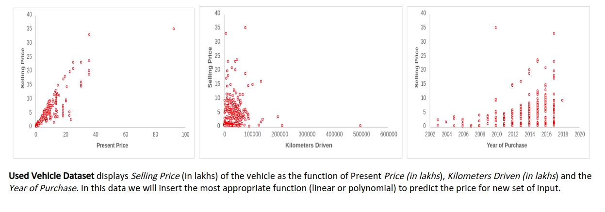 Used Vehicle Dataset consists of the selling price of 301 cars and bikes along with the attributes of each vehicle as Current Price, Kilometers Driven, and Year of Purchase. We aim to design a model to predict the worth of the used vehicle. Therefore, we must determine the relationship between the vehicular attributes and the selling price. It leads us to know the effect of changes in attributes upon the price of the vehicles. Below is shown the dataset with selling price as a function of each attribute.