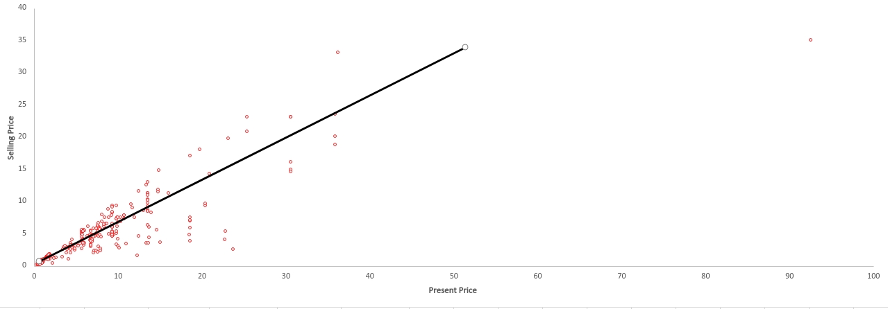 Estimating the function f(x) will give us the estimated values of Y, which may differ from the actual values in the dataset. Let us understand it with the help of a visualization graph. Considering the data plot of attribute Present Price against Selling Price, we estimate f(x) to be a linear function (which means we fit a line into our data).