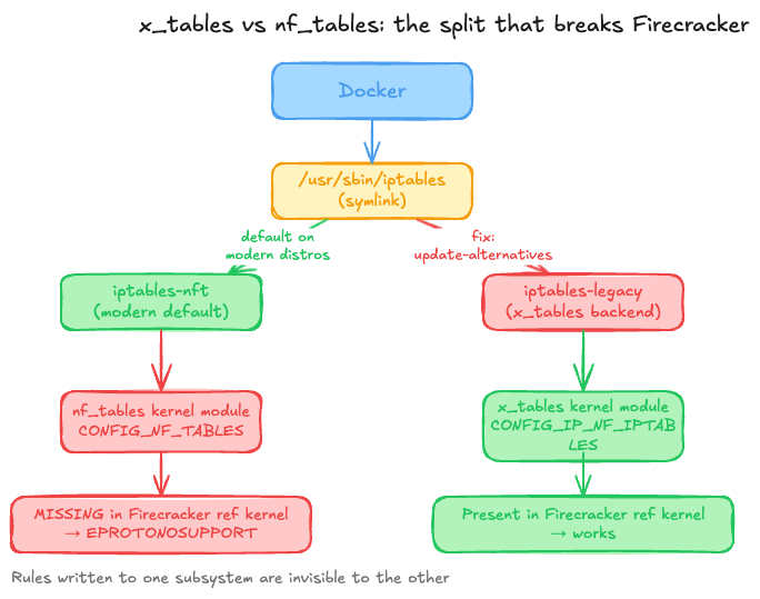 The x_tables / nf_tables split: where the Firecracker failure actually lives