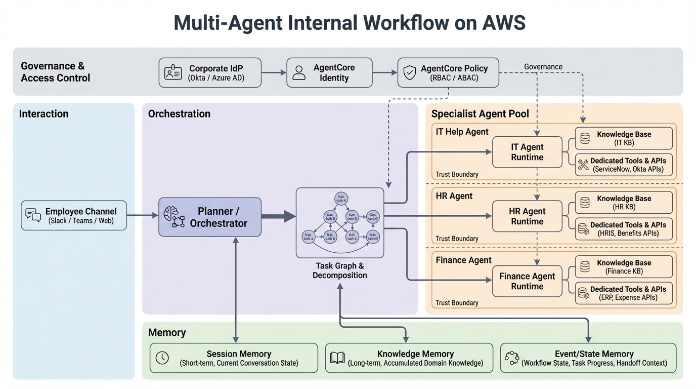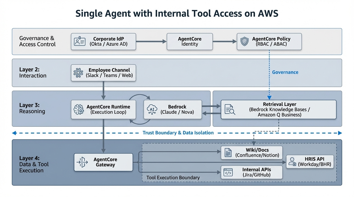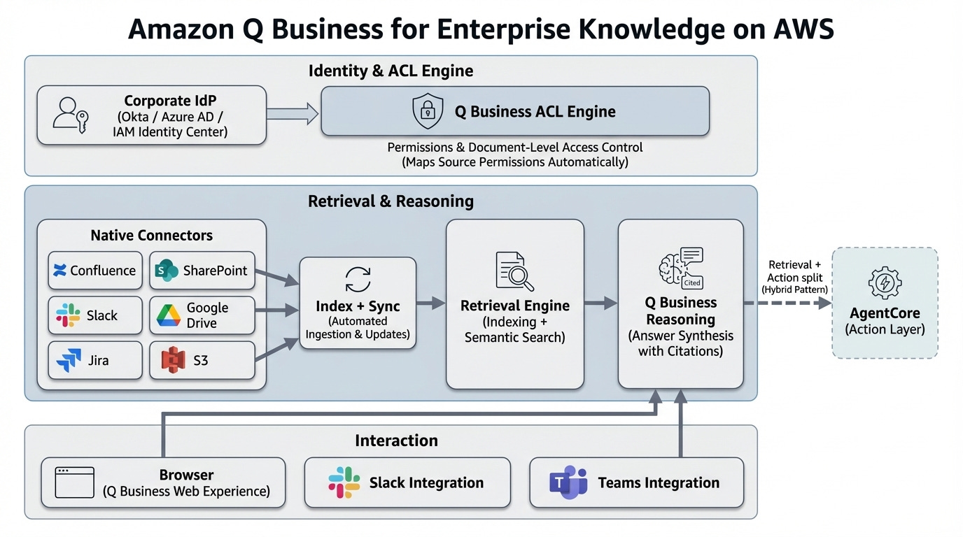 When the same workflow also needs to take actions (create tickets, provision access, call APIs), pair Q Business for retrieval with AgentCore for execution.