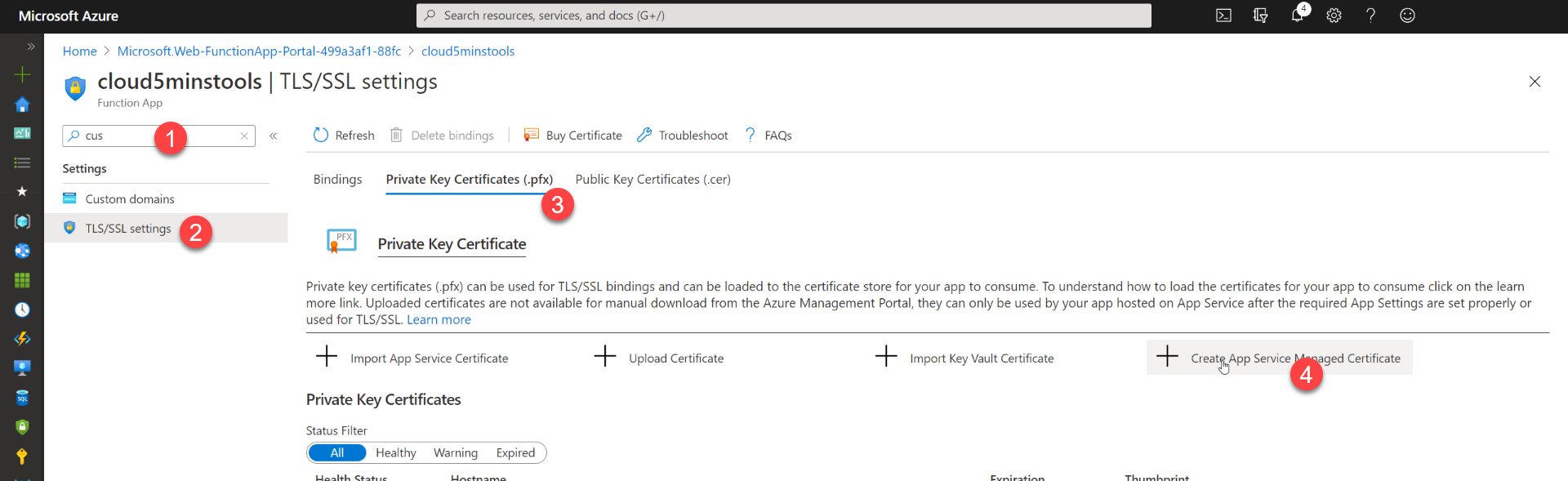Now that your custom domain is mapped, let's fix the "not secure" warning by adding a certificate. From the Azure portal return in the App blade. Repeat the previous search for "custom", and select the option TLS/SSL settings. Click the Private Key Certificates , and the Create App Service Managed Certificate button. Select the domain previously added and saved. It will take a few moments to create the certificate.