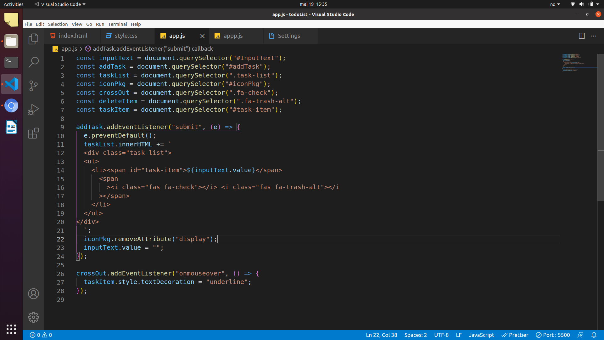 I am having a problem to find a selector for the text inside my "li" to target with JavaScript. The problem is that I have a nested "span" element with two icons in my "li". That gives me a problem just to "li" to target it, since, it also covers the "span" with icons. What I am trying to do is add {text-decoration: 'line-through'} when the 'check' icon is clicked. and remove the text, when 'trash'icon is clicked. As I said, my problem is targeting the text within the "li" .