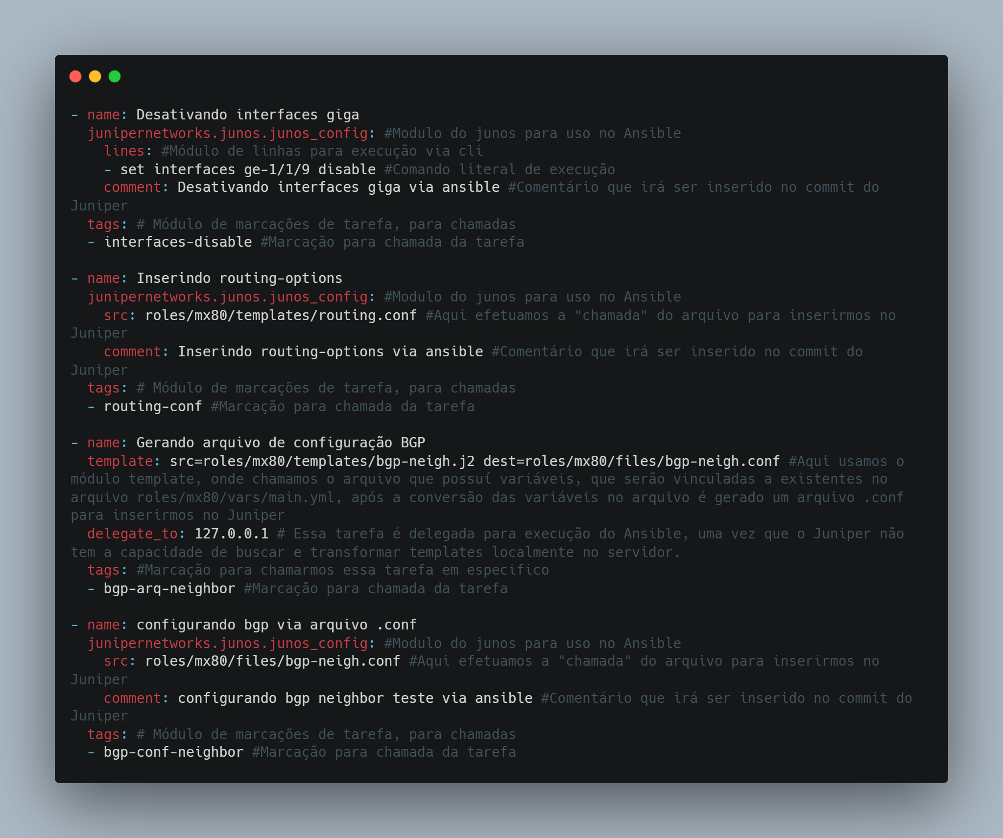 Nesse tutorial, foi dado continuidade na execução de tarefas com Ansible e automação de tarefas em Juniper, creio que já é um bom norte pra quem está começando e quer se aprofundar mais com automação de redes.