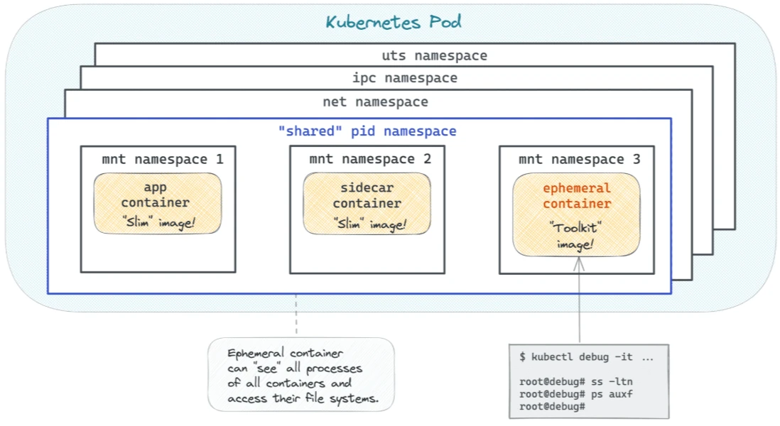 While troubleshooting a Pod, I'd typically want to see the processes of all pods containers, as well as I'd be interested in exploring their filesystems. Can an ephemeral container be a little more unraveling?