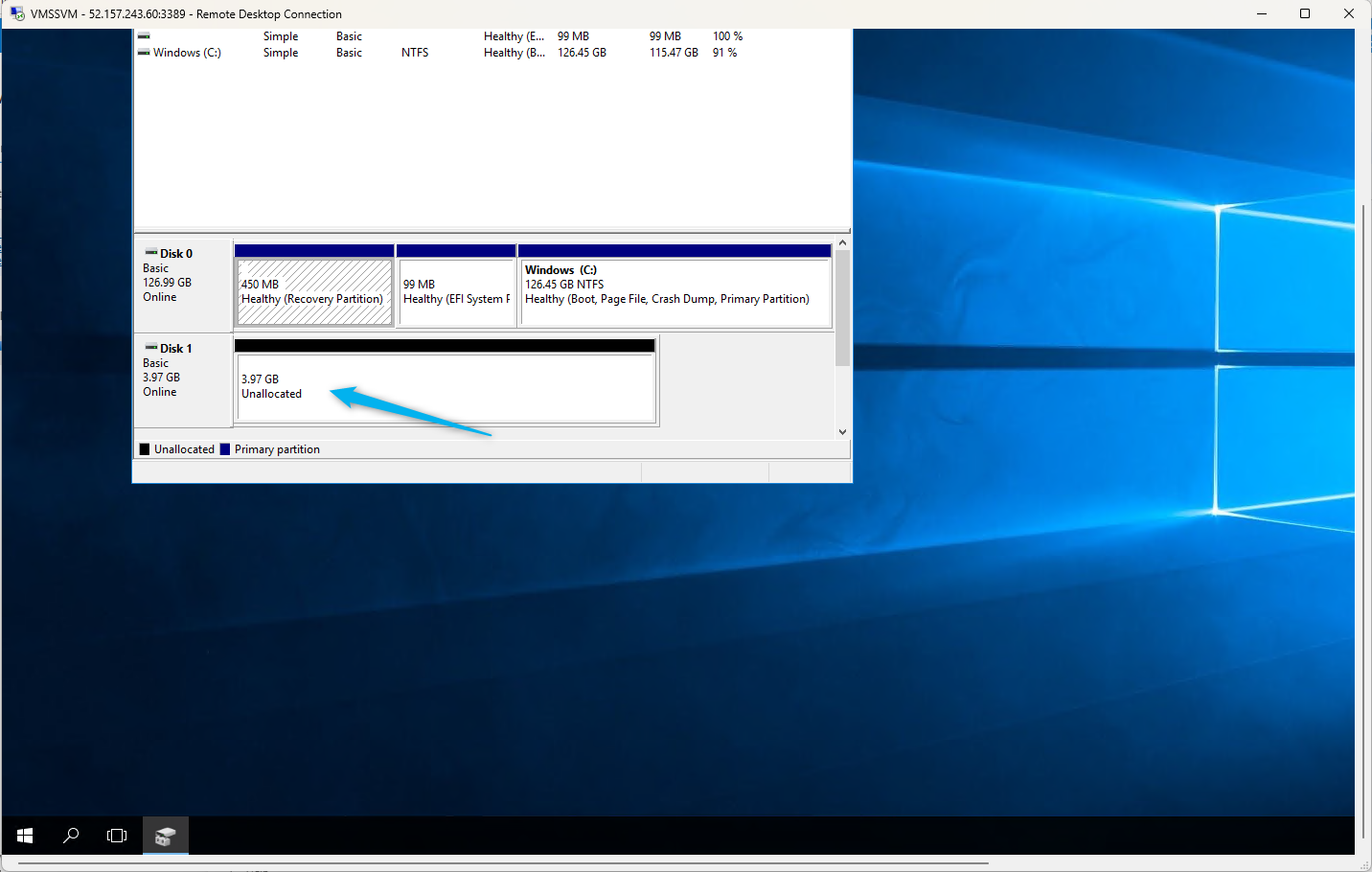- to initialize the disk, search for disk management in the search bar of the newly deployed vm
