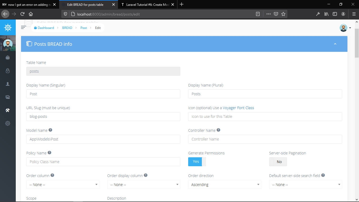 I think I fixed the the error that I was having for days. Instead of changing the post slug url to blog-post. I changed the Post Model name, and database name posts to blog_post. and I also changed some code on the database migrations "post_tags" inside this php file I changed the post_id to blog_post_id, and I also change the column name post_id to blog_post_id into the database to make it work. Now I can continue to your tutorials, without existing errors. Thank you for providing me some possible solutions. It made me think outside the box to do this solution on my head. Thank you, now I can continue to your next tutorial on the blog.