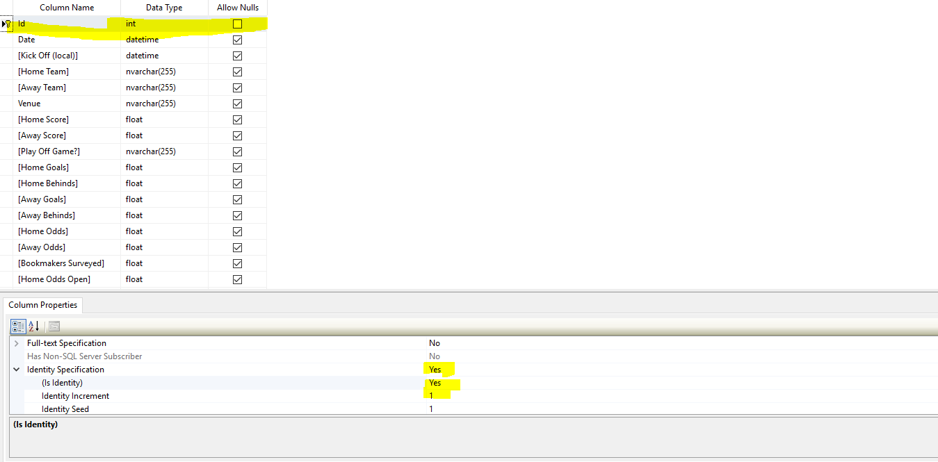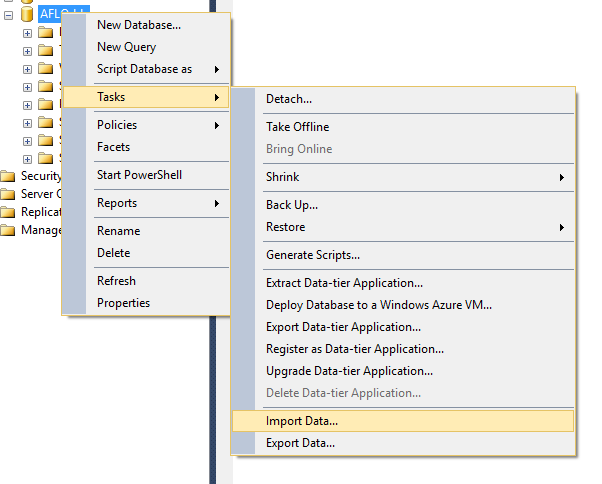 a. Open up SQL Server and create a new database. Mine will be called AFLOdds.