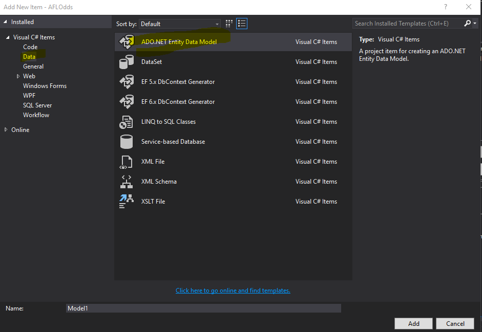 - Add a new file -> ADO entity data object