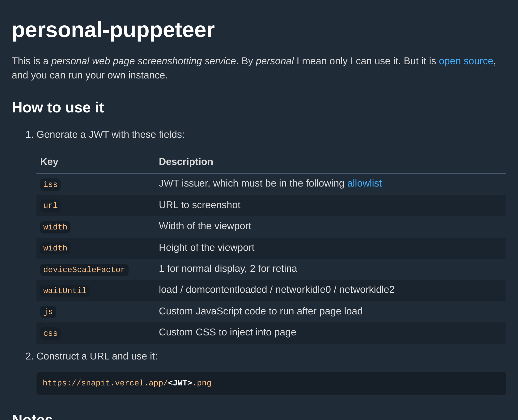 This is a personal web page screenshotting service. Basically, it exposes an API that I can use to generate screenshot of any URL By personal I mean that only I can use it. It is secured with JWT. But it is open source, and you can run your own instance.