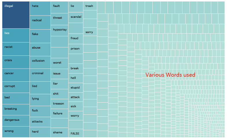 The most frequent words are, for example, “like”, “great” and “right”. Most word choices are basic and colloquial, like “wow” and “cool,” whereas the use of negative words is much more multilateral. There are 809 kinds of negative word that most of them are formal and advanced. The most frequently used are “illegal,” “lies,” and “racist.” Other advanced words such as “delinquent”, “inflammatory” and “hypocrites” are also present.