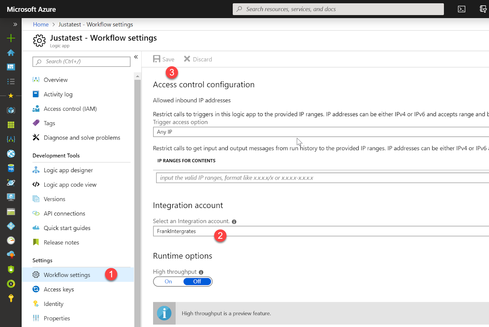 We now need to assign it to our Logic App. From the Logic App blade, in the options list select Workflow Settings. Then select your integration account, and don't forget to save!