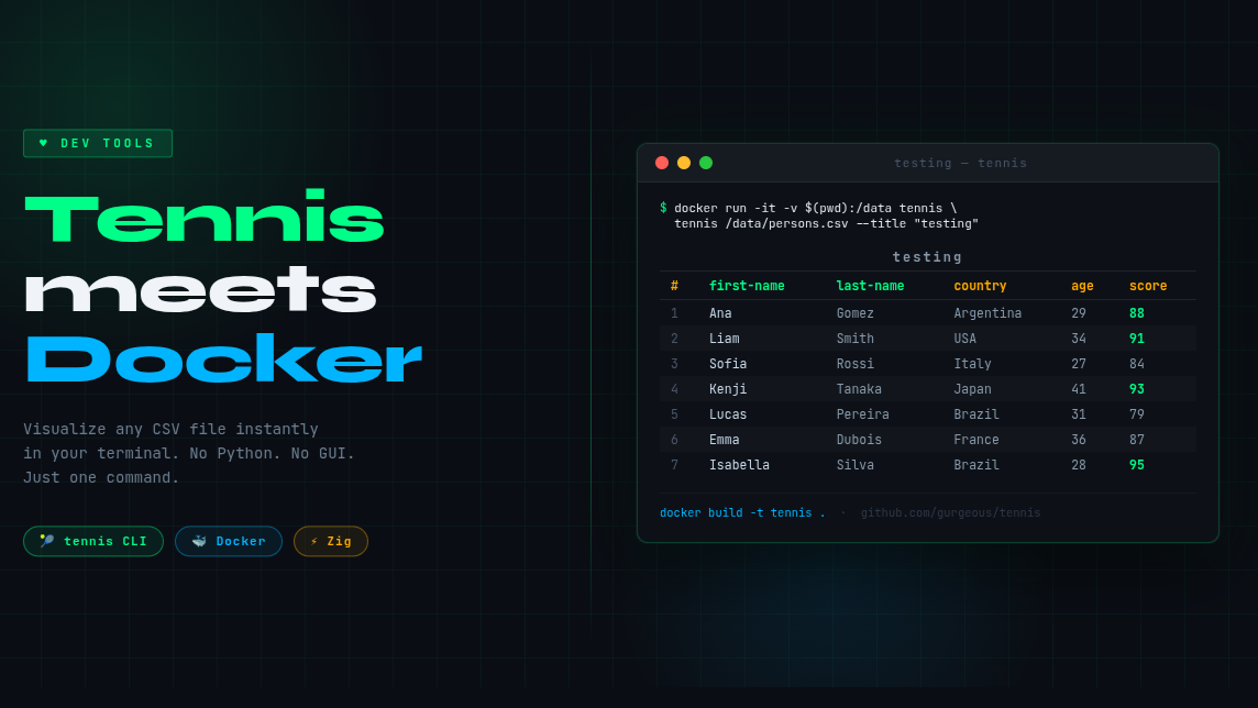 Meet tennis — a blazing-fast terminal table viewer built in Zig. No Python. No pandas. No GUI. Just clean, colored, readable tables right in your shell.