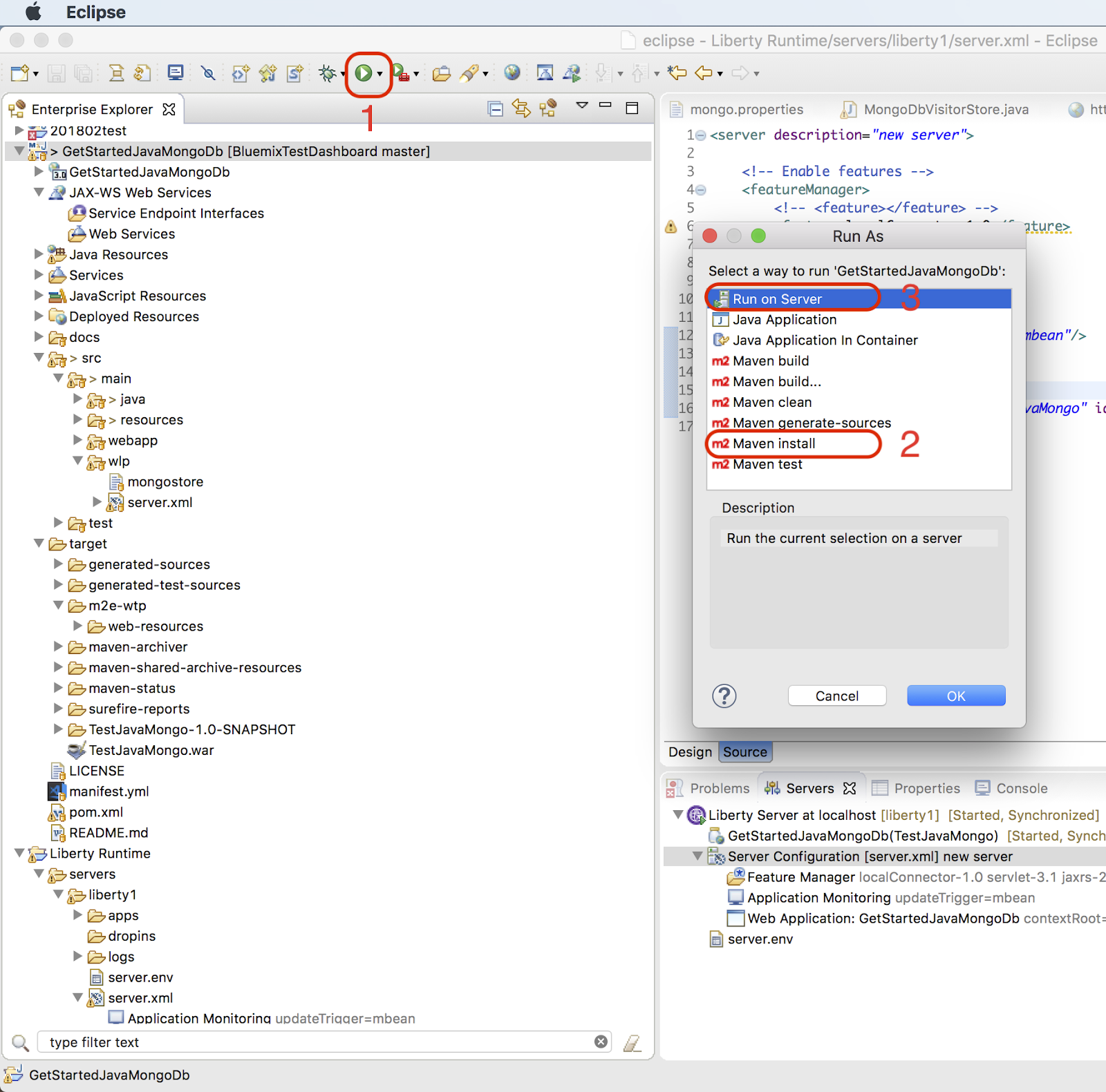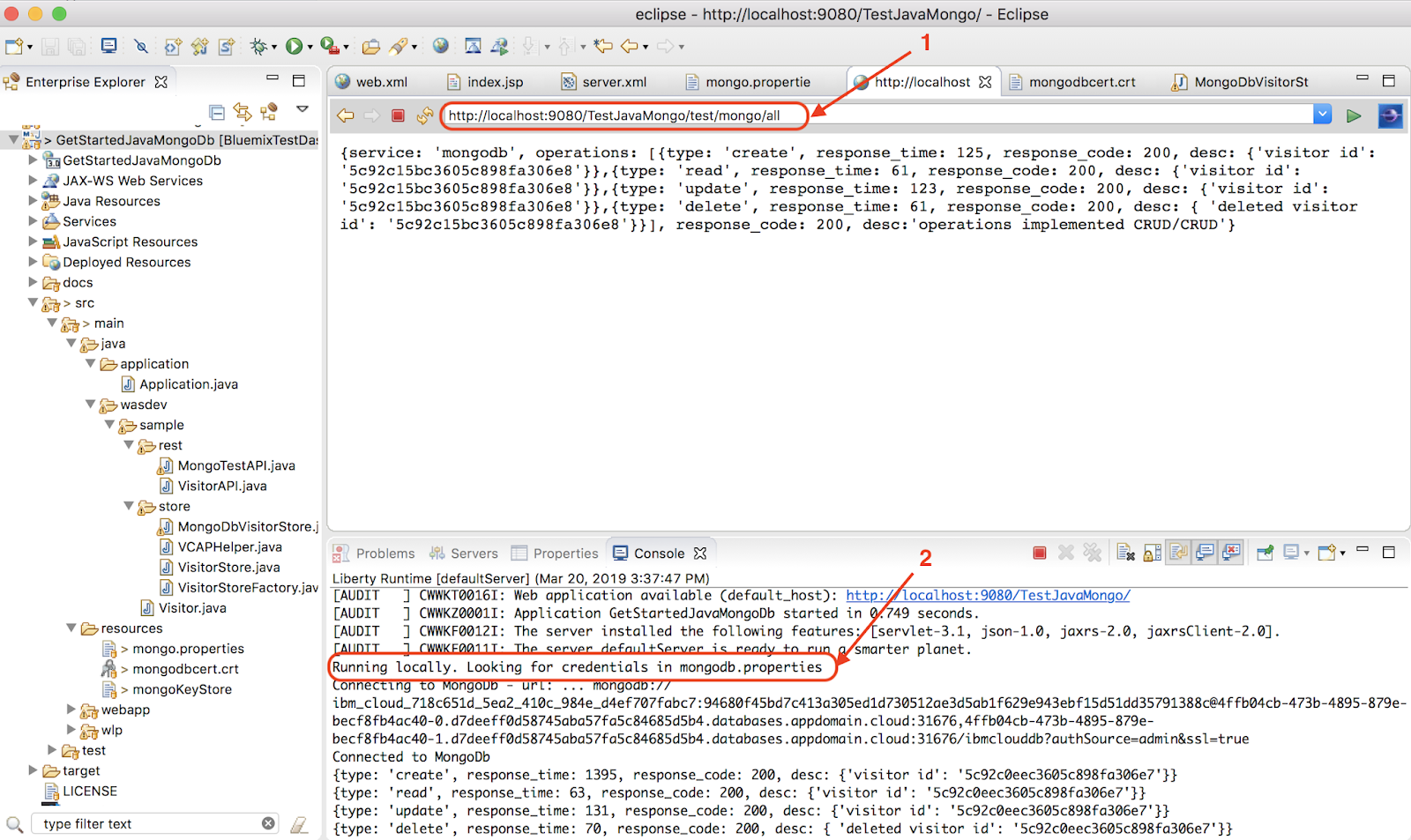 Furthermore for the local Liberty and MongoDB tests you want to define the MongoDB URL in the local file here: /BluemixTestDashboard/GetStartedJavaMongoDb/src/main/resources/mongo.properties . For that use the previously captured elements from json: