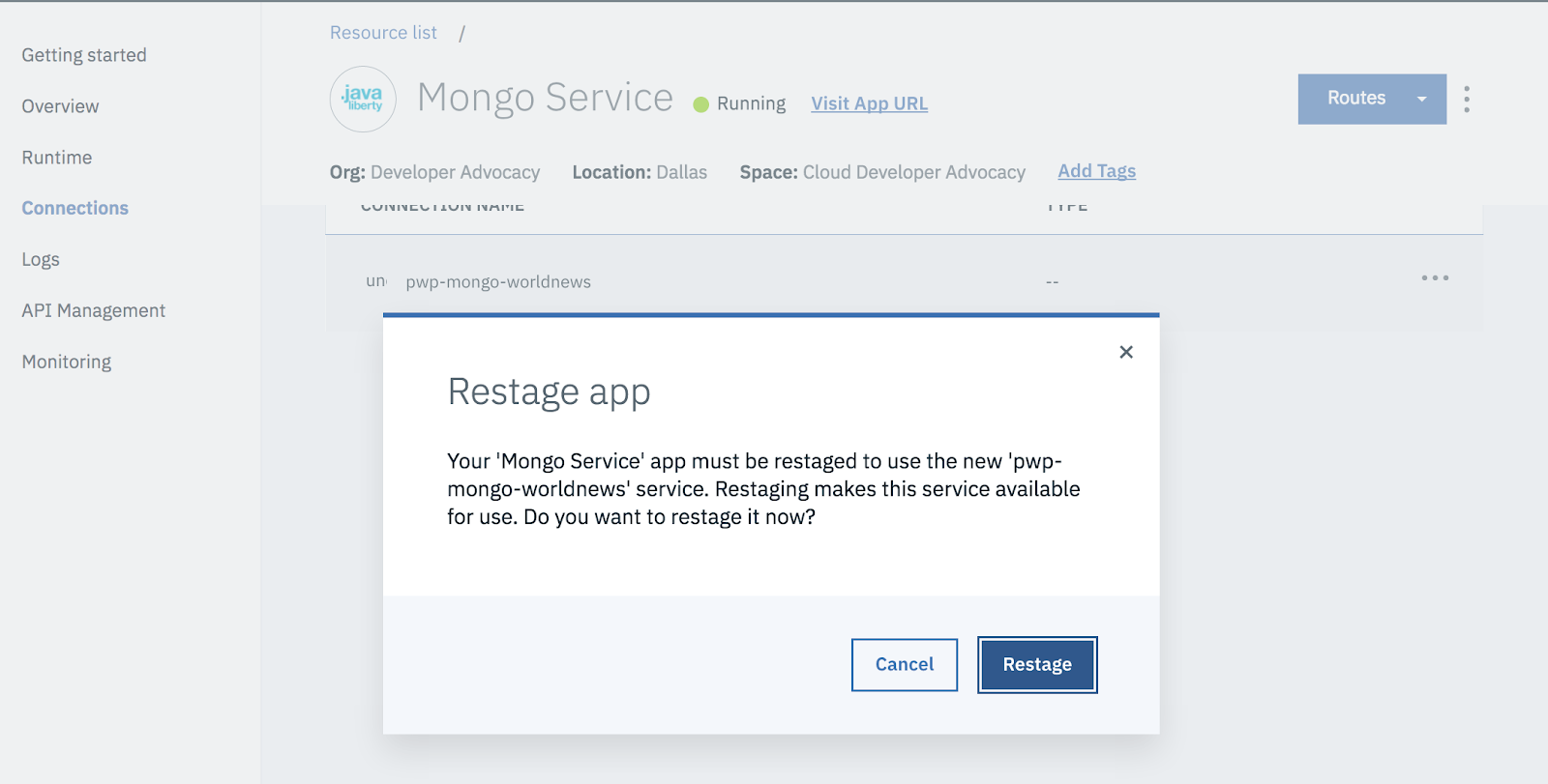 Once the two are created, bind the MongoDB service with the Liberty for Java app.