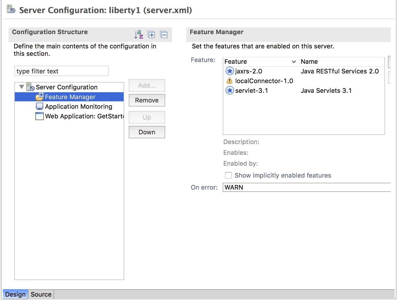 In order to test and run the service locally, you might need to install the JAXRS-2.0 feature on the local server. I am using Eclipse IDE for that purpose. The server configuration screen with added JAXRS-2.0 looks like the image below: