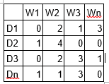 Here D1,D2,D3...Dn are different documents and W1,W2,W3....Wn are the words that belong to our dictionary(all unique words in the corpus). DxWy gives the number of time the word has occurred in the document.