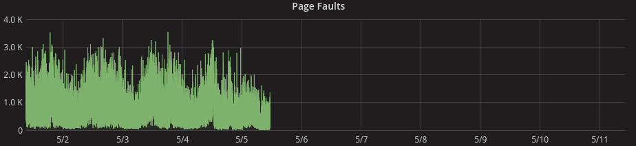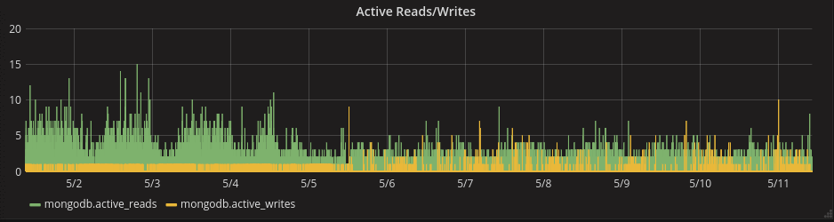 In May 2017, Wanderu migrated to the WiredTiger storage engine in MongoDB 3.4. They took some screenshots of some of their performance graphs that covered a 10 day period, five before and five after, their migration on 5/5. They were kind enough to share these images with me and approved of their use in this article.