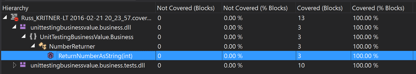 With the above test and code coverage, we can safely say we have thoroughly tested our code. Our requirement is extremely simple as of now, but next time we'll expand our requirements by a bit, while still keeping focus on our unit tests and code coverage. Here's the repo as of this post: https://github.com/Kritner/UnitTestingBusinessValue/tree/f8b21a5bde31635c2f37d530130d8bd393eee23e