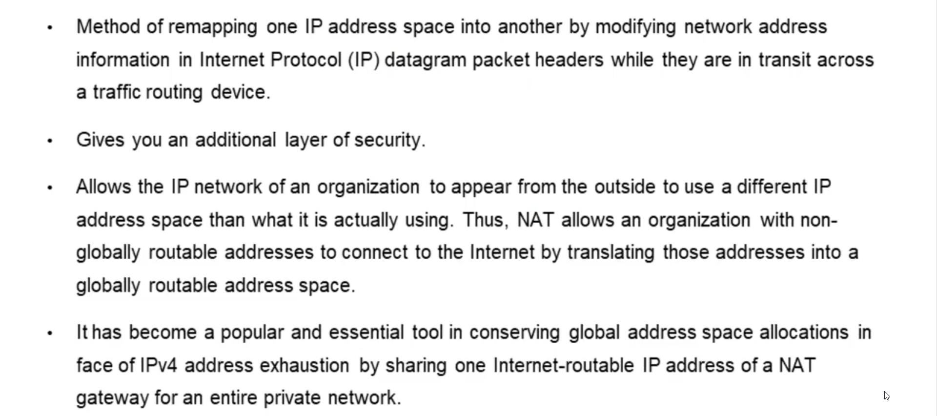 NAT or Network Address Translation is essentially a method of converting a private IP address to a public IP address when connecting to the Internet. NAT remaps the IP address by modifying information in the IP datagram packet headers as they transit across a traffic routing device. This is just a summerized version of what NAT is but you can read more about it through a FAQ form on CISCO's website Network Address Translation (NAT) FAQ. Below is a diagram of a Juniper NAT router and 4 key facts about NAT.
