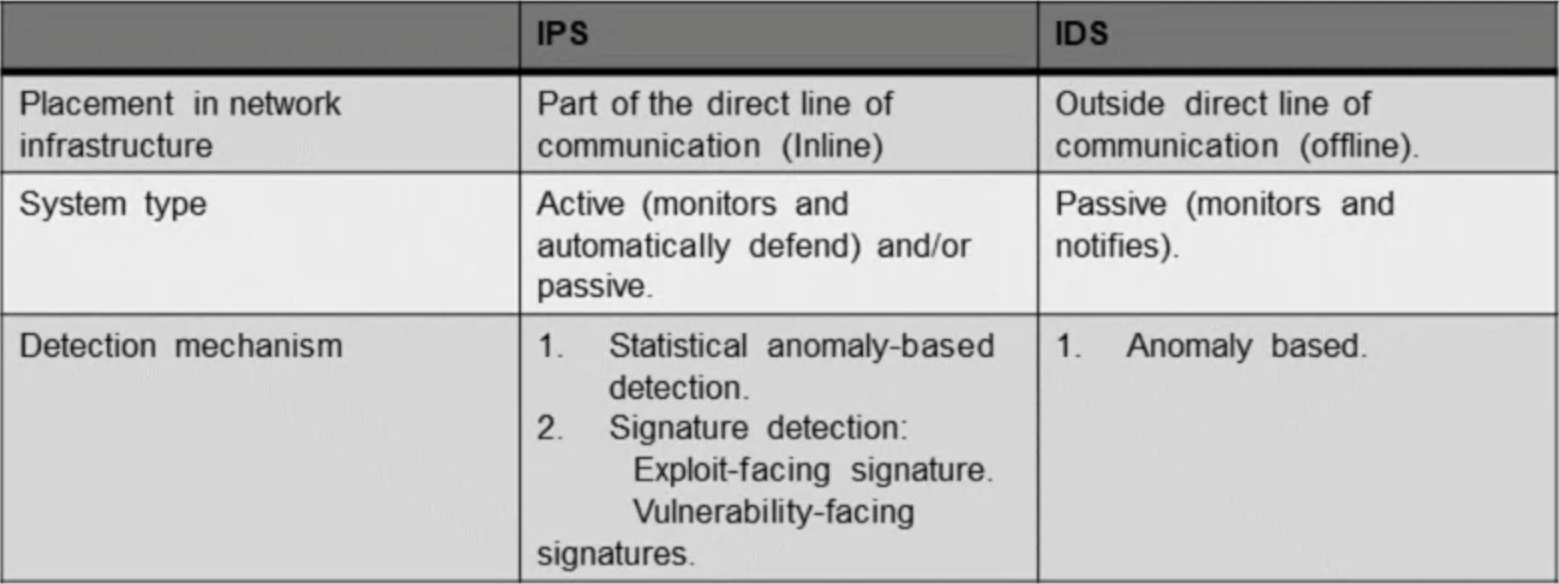 An IDS needs to only detect threats on a network, because the IDS only detects threats and reports it's finds to an administrator. It is placed outside of the real-time communication path of the sender and receiver of information, which makes it a passive system. Due to the IDS not keeping up with real-time communication it will often take advantage of a TAP or SPAN port to analyze a copy of the inline network traffic stream. This ensures that the IDS does not impact inline network performance. Unfortunately due to the nature of IDS solutions, they lack the ability to prevent a detected exploit from taking over the system. Attackers are capable of quickly exploiting vulnerabilities once they've infiltrated the network. Rendering the IDS useless.