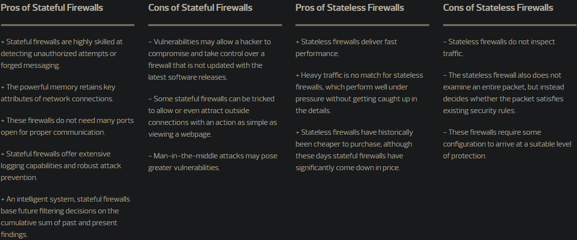 To start off the topic of networking let's discuss what firewalls are and how they utilize stateless and stateful inspection, then compare stateless firewalls to stateful firewalls. According to Cisco (one of the leading companies in network technology) firewalls are "A firewall is a network security device that monitors incoming and outgoing network traffic and decides whether to allow or block specific traffic based on a defined set of security rules. Firewalls have been a first line of defense in network security for over 25 years. They establish a barrier between secured and controlled internal networks that can be trusted and untrusted outside networks, such as the Internet. A firewall can be hardware, software, or both.". Now that we know what a firewall is, let's dig a little deeper into how firewalls filter incoming and outgoing network traffic stateless and stateful inspection. Regular routers and some firewalls use the stateless way of filtering packets, this means the firewall inspects each packet without any knowledge of previous packets, the firewall will inspect the destination and source address of the packet and then block or restrict addressess that are deemed untrusted. There may also be an Access Control List rule (ACL) that will determine weather the source addess and destination port of the packet is allowed on the network or if the destination address is allowed to be accessed or not. A few use cases for stateless inspection include: