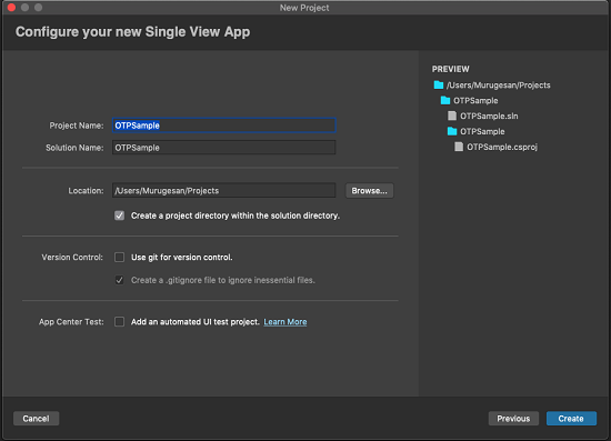 Open Visual Studio for Mac >> New >> In the left plane select App under iOS >>