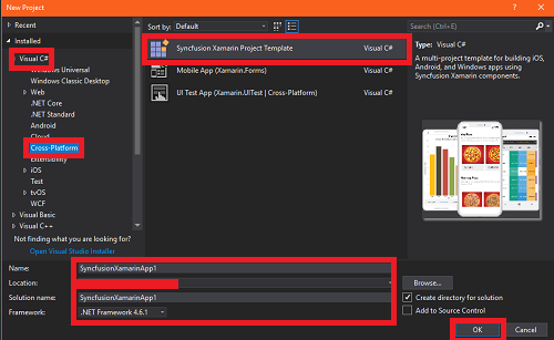 You can create a new Syncfusion Xamarin Project Template by going to File >> New Project >> Visual C# >> Cross-Platform >> select Syncfusion Xamarin Project Template and give the app's name and the Solution name and select the Framework version. Then click OK.