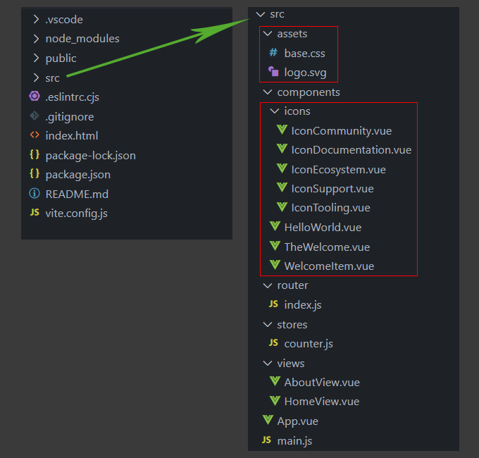 To do this, first, close your terminal and delete all files/folders within the red borders. Now, we’re ready to start writing the project’s code. Let’s first open main.js file to see how the Pinia root store is created and included in the project: