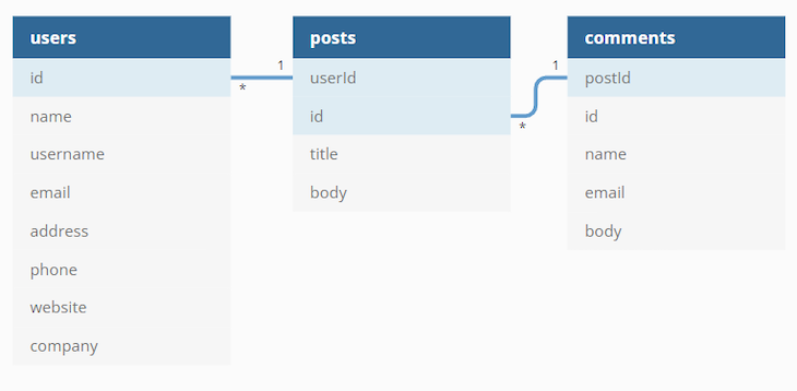 As you can see, users are connected to posts by its id, and posts are connected to comments in the same way. So, to get a post’s author, we can use userId, and to get the comments for a post, we can use postId. With this knowledge, we can start mapping the data to our stores.