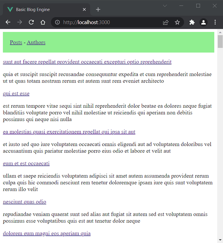 Here, we changed the link labels by replacing Home with Posts and About with Authors. We also changed the Authors link from /about to /authors and removed all default styles and added our own for the navbar class, which we add to distinguish the navigation from the posts. Ok, now we’re ready to dive deeper into Pinia and define the necessary app stores.
