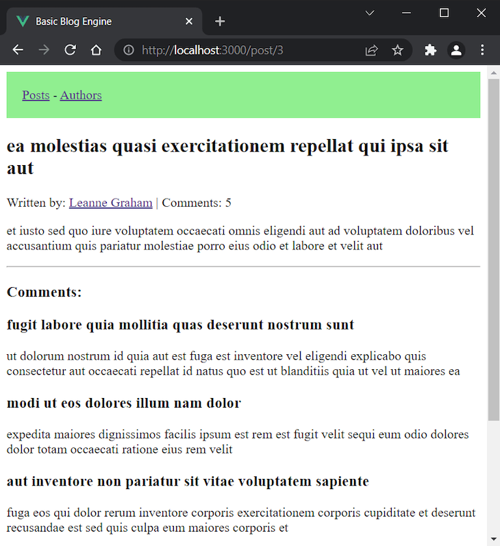 Here, we define the needed props by using the defineProps function and extract the necessary data from the comment store. Then, we fetch the comments so the getPostComments can be updated properly. In the template, we first display the post title, then, in a byline, we add an author name with a link to the author’s page and the number of comments in the post. We then add the post body and the comments section below. To display comments, we’ll use separate component and pass the post comments to the comments prop.