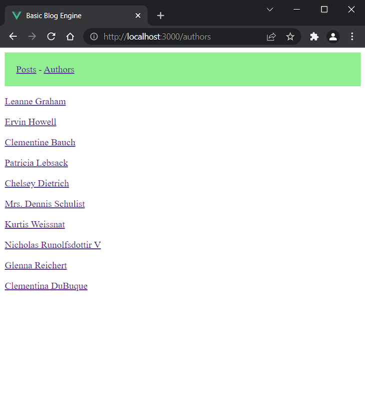 Here, we change the path and name to /authors and authors, respectively, and import the AuthorsView.vue with lazy loading. Run the app again. You should see the following when you visit the authors view: