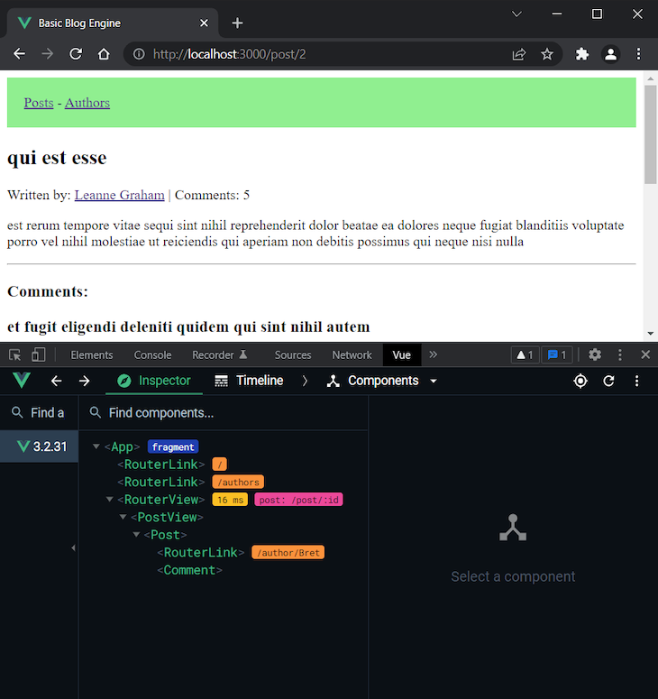 We can see that all routes we created are here and the one for the single post is active because it’s currently being used. Now, let’s switch to the Components tab so we can explore the app components tree for the post view: