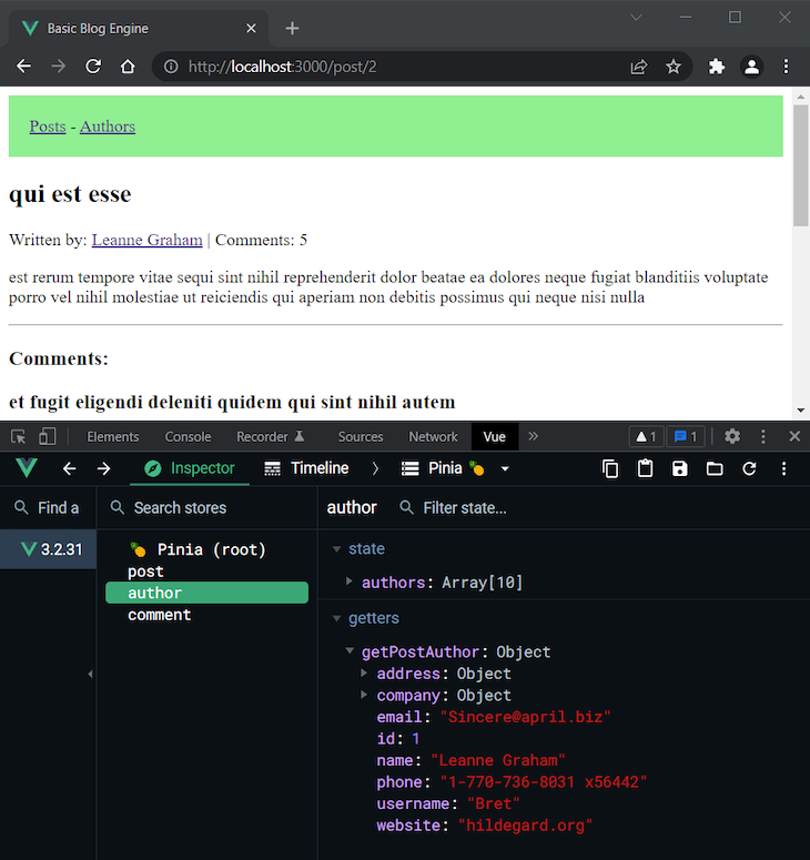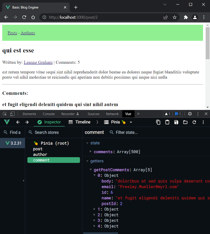 Again, we can see that the name of the first comment matches the one displayed in the browser. So, everything worked as expected. Now you know how to create, use, and inspect Pinia stores.