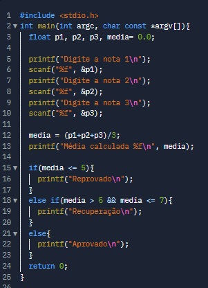 Em um programa desenvolvido na Linguagem C, foi solicitado que o desenvolvedor criasse uma lógica que calculasse a média de três notas e, logo após, indicasse ao usuário se o aluno foi reprovado (média abaixo de 5), se ficou em recuperação (média entre 5 e 6.9) ou aprovado (acima de 7). Entretanto, o usuário acusa que o programa está com problema, pois ao digitar as três notas, o valor da média se for abaixo de 7 mostra na tela o status errado.