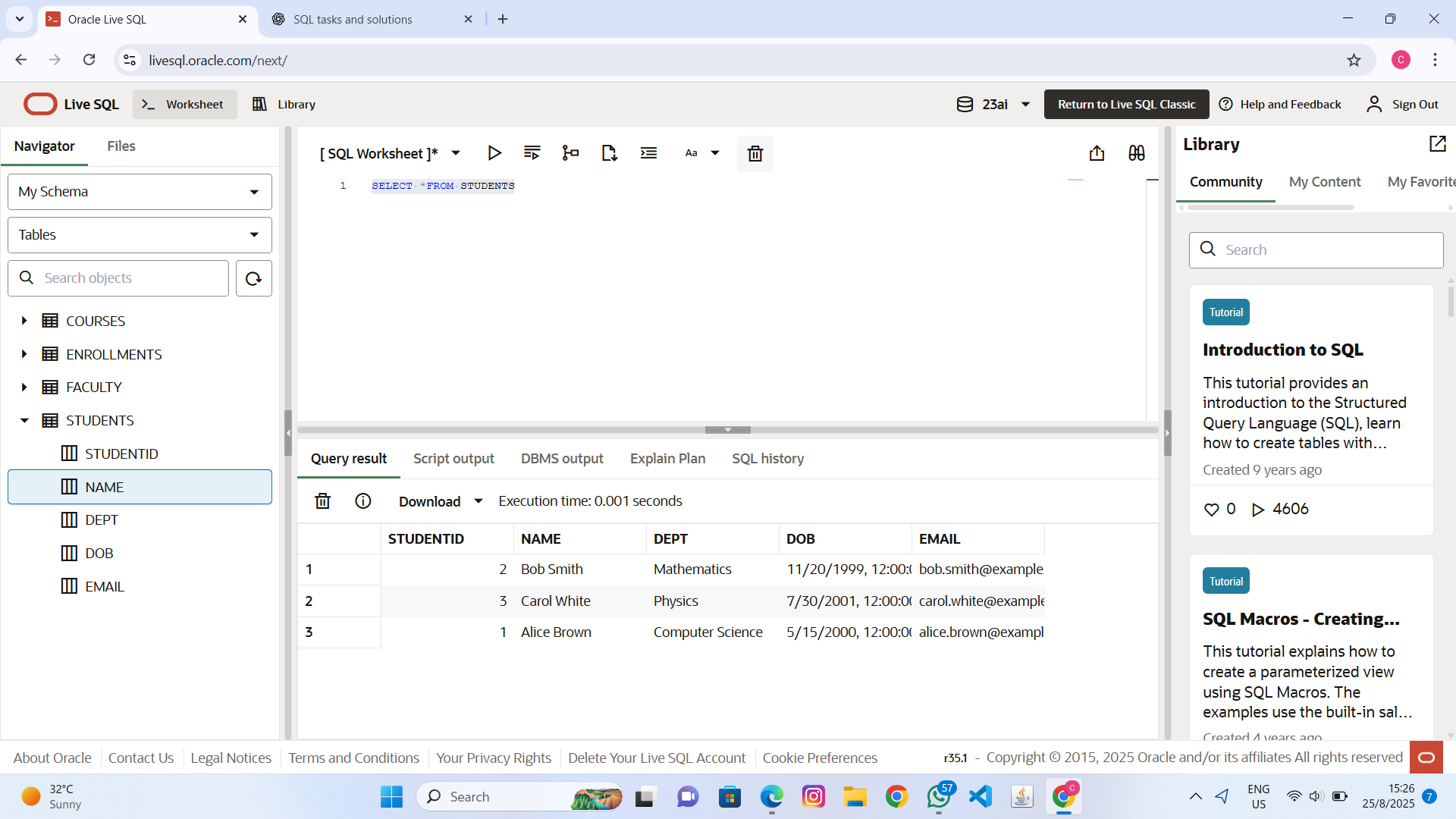 - Inserting Sample Data INSERT INTO Students (StudentID, Name, Dept, DOB, Email) VALUES (1, 'CATHERINE', 'Computer Science', TO_DATE('2001-05-15', 'YYYY-MM-DD'), 'cathy@example.com');