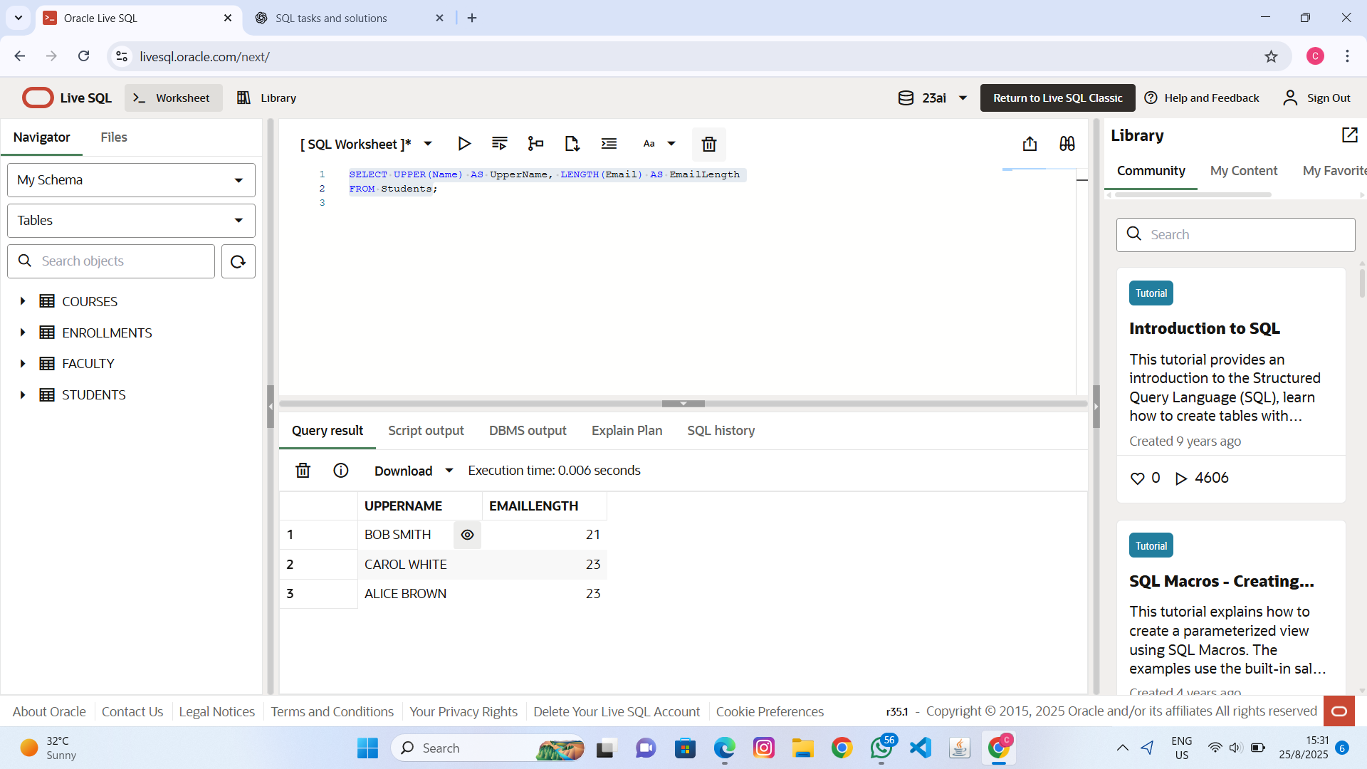- Using SQL Functions SELECT UPPER(Name) AS UpperCaseName, LENGTH(Email) AS EmailLength FROM Students;
