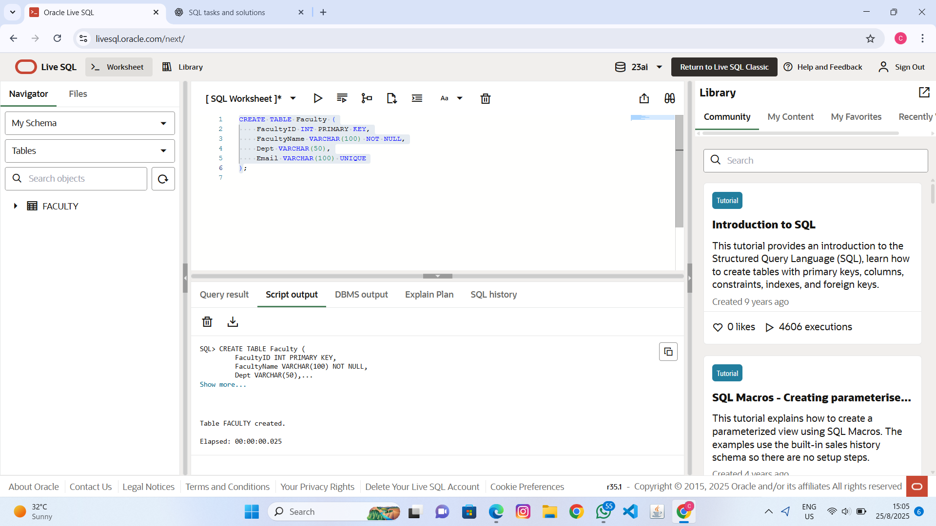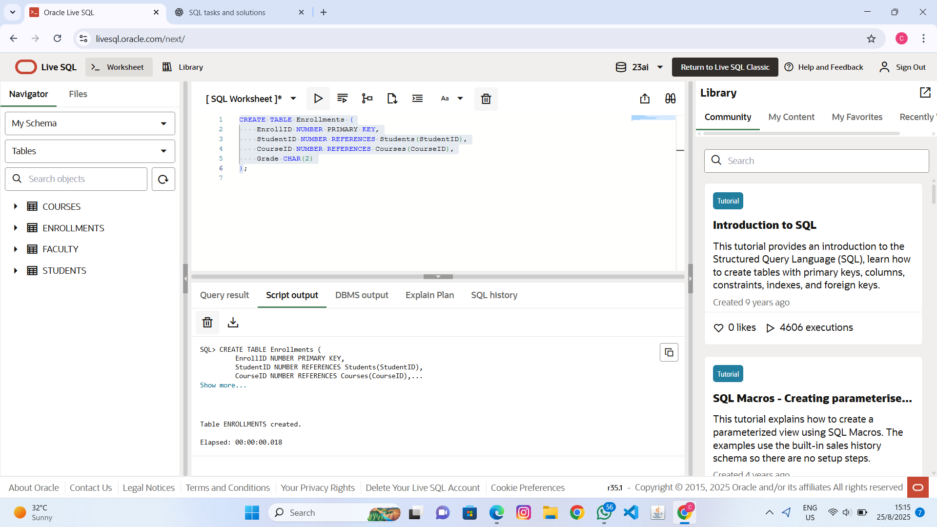 Design and create tables for Students, Courses, Enrollments, and Faculty
