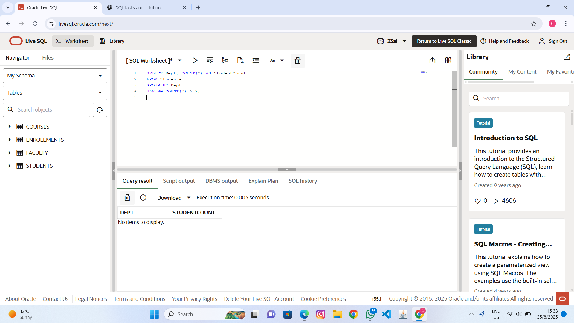 - GROUP BY with HAVING SELECT Dept, COUNT() AS StudentCount FROM Students GROUP BY Dept HAVING COUNT() > 2;