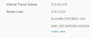 Note that you already have Tier-0 to Tier-1 automatically set up - click "View More" under router links, and you'll see it's using the prefix _ fcc4:: , _which is currently reserved by RFC4193 for Unique local connectivity. Props to VMWare for following spec!