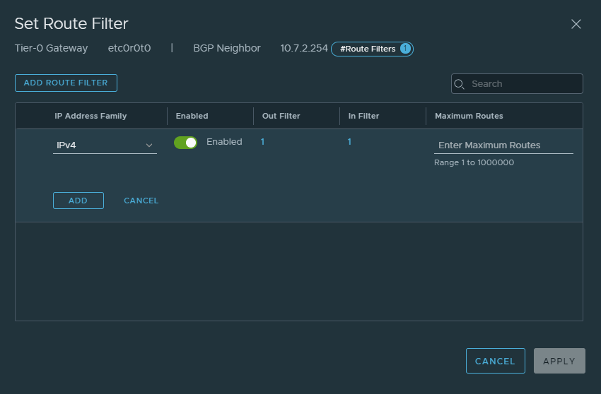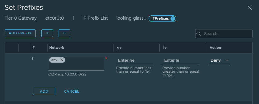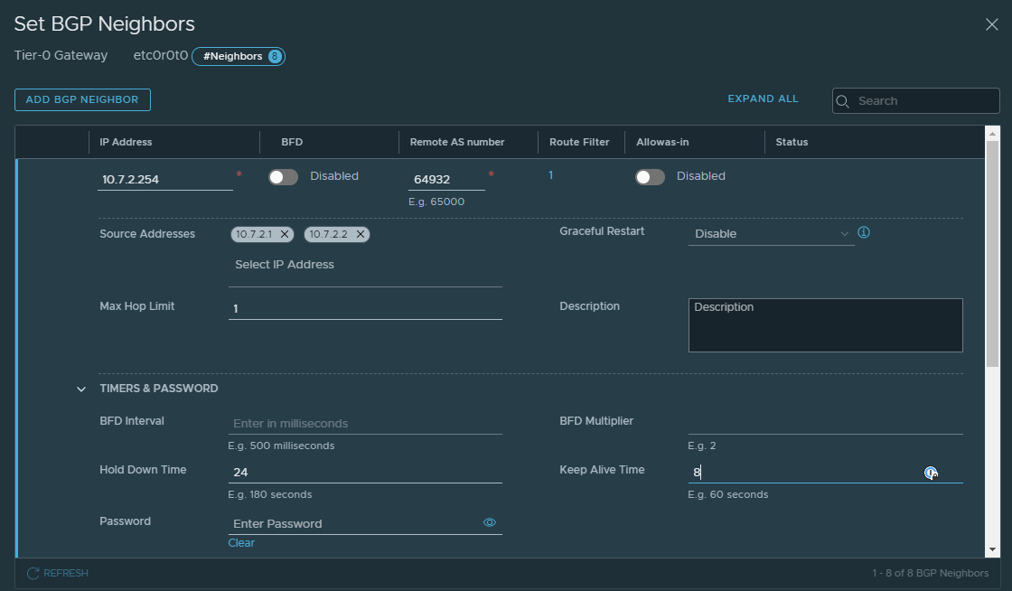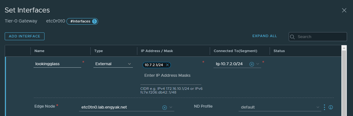 In this case, I'll deploy to an NSX-T External Port and peer up, with fully implemented ingress filtering: