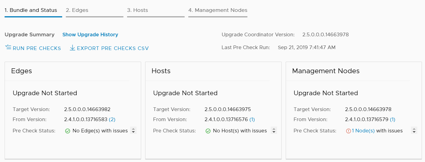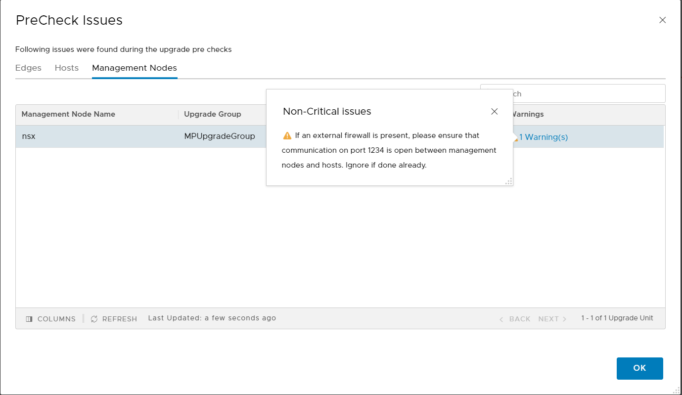 Once the upgrade coordinator is set up, it's time to run pre-checks. This one warns you about the messaging port change.