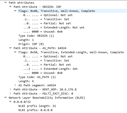 ****EXCEPTION 0x4103 - 57 (0000)**** I:008e7cd1 F:00000004qbmlpar2.c 1352 :at 20:54:21, 2 May 2021 (1822572648 ms)UPDATE message contains NLRI of 0.0.0.0.****PROBLEM 0x4102 - 46 (0000)**** I:008e7cd1 F:00000004qbnmmsg.c 1074 :at 20:54:21, 2 May 2021 (1822572648 ms)NM has received an UPDATE message that failed to parse.Entity index = 1Local address = 10.6.64.9Local port = 0Remote address = 10.6.64.12Remote port = 0Scope ID = 0****EXCEPTION 0x4102 - 71 (0000)**** I:008e7cd1 F:00000020qbnmsnd2.c 167 :at 20:54:21, 2 May 2021 (1822572648 ms)A NOTIFICATION message is being sent to a neighbor due to an unexpectedproblem.NM entity index = 1Local address = 10.6.64.9Local port = 0Remote address = 10.6.64.12Remote port = 0Scope ID = 0Remote AS number = 64905Remote BGP ID = 0X0A06400CError code = UPDATE Message Error (3)Error subcode = Invalid Network Field (10)