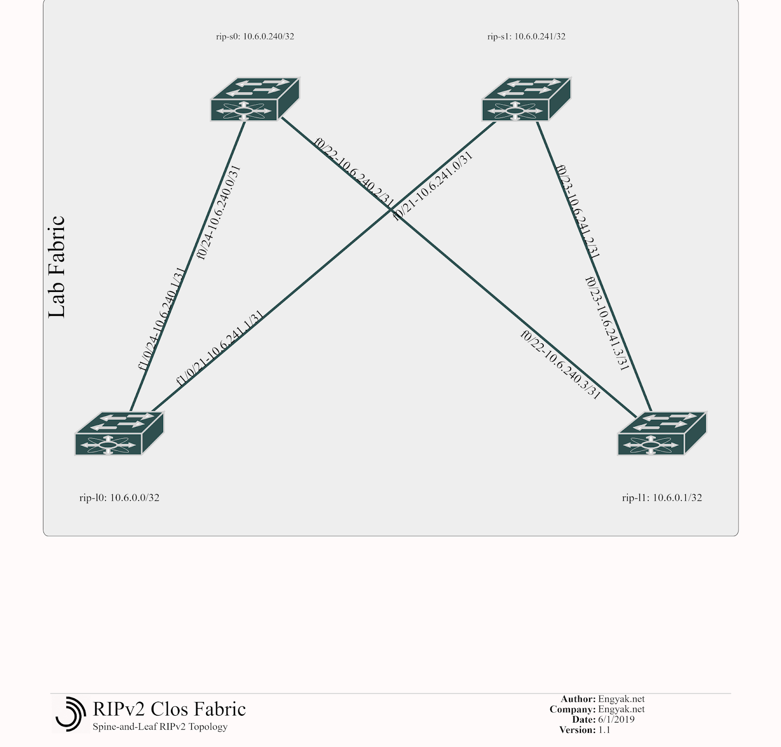 hostname rip-s0interface Loopback0 ip address 10.6.0.240 255.255.255.255interface FastEthernet0/22 no switchport ip address 10.6.240.2 255.255.255.254interface FastEthernet0/24 no switchport ip address 10.6.240.0 255.255.255.254hostname rip-s1interface Loopback0 ip address 10.6.0.241 255.255.255.255interface FastEthernet0/21 no switchport ip address 10.6.241.0 255.255.255.254interface FastEthernet0/23 no switchport ip address 10.6.241.2 255.255.255.254