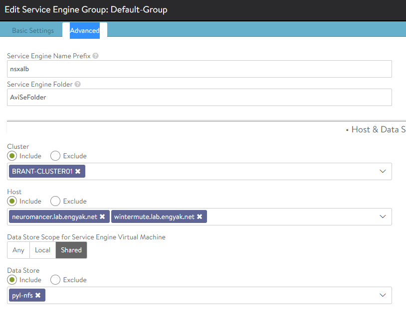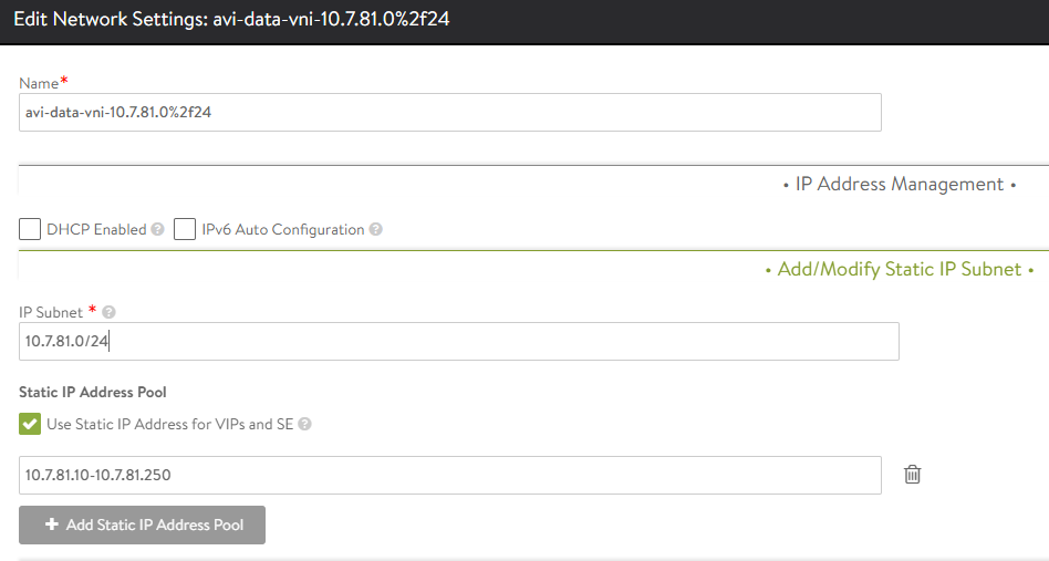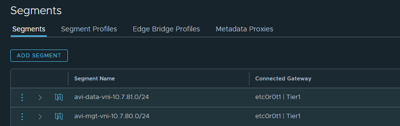 Data Segments (NSX-T Overlay). Avi will build direct routes to IPs in this network for vIP processing. I built 3 -