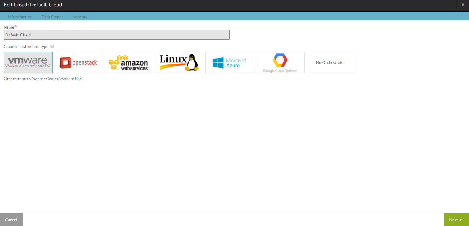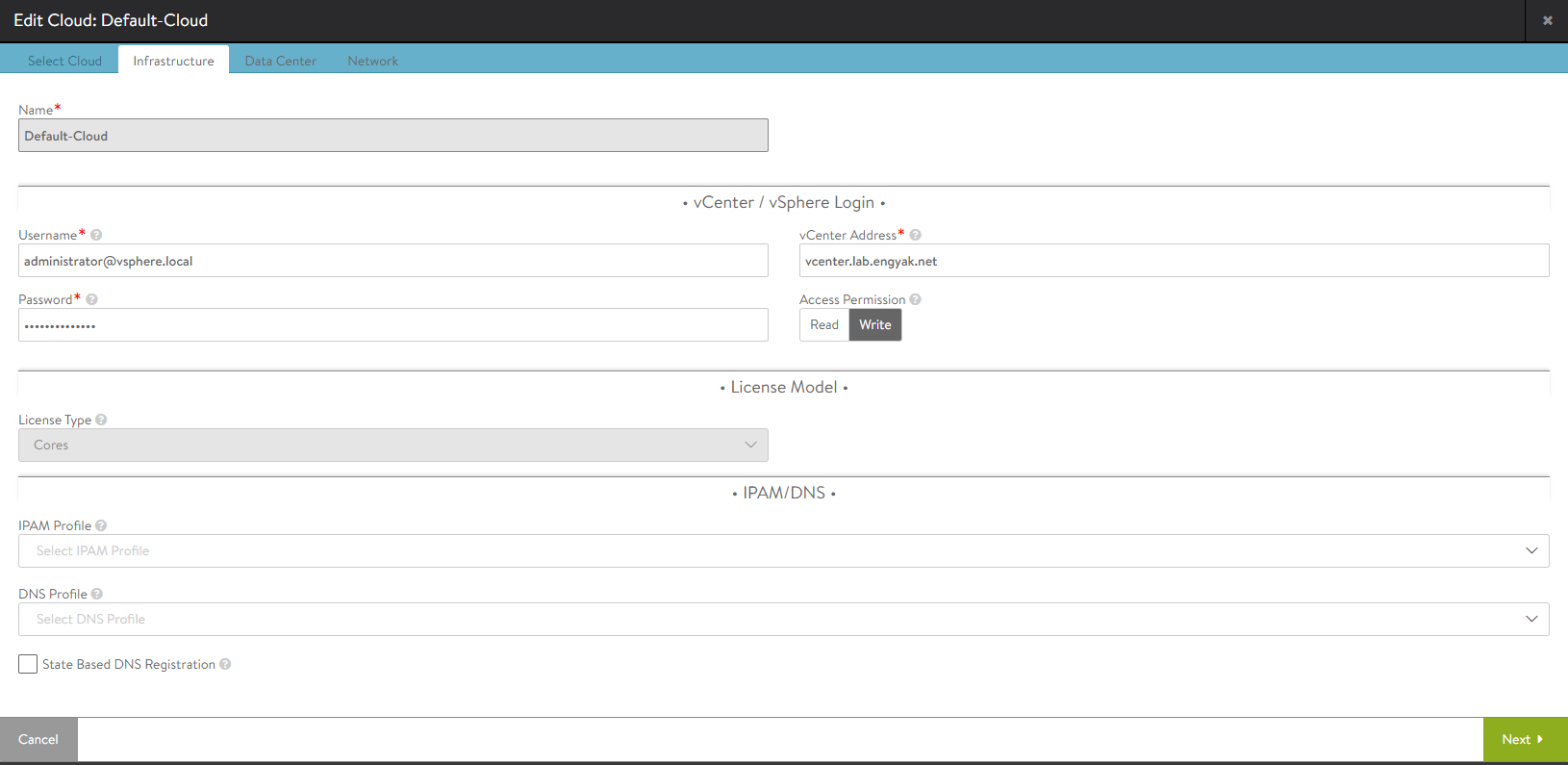 Clouds are Avi's construct for deployment points - and we'll start with the more traditional one here - vCenter. Most of this has already been configured as part of the wizard above. Several things need to be finished for this to run well, however: