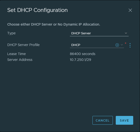 NSX-T is unsurprisingly symbiotic here. I have built a dedicated Tier-1 for NSX ALB, and we're going to provide DHCP services via the Tier-1 router. If this was a production deployment or a VVD-compliant SDDC, this should be performed with a DHCP relay. I just haven't set aside time to deploy DHCP/IPAM tools for reasons that are beyond me.