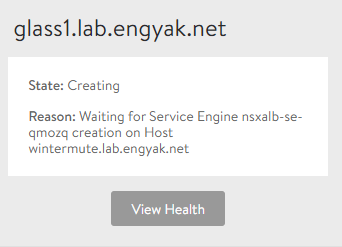 Service engines take a while to deploy - don't get too obsessive if the deployment lags. There doesn't appear to be a whole lot of logging to indicate deployment stages, so the only option here is to wait it out. If a service engine doesn't deploy quite right, delete it. This is not the type of application we just hack until it works - I did notice that it occasionally will deploy with vNICs incorrectly configured.